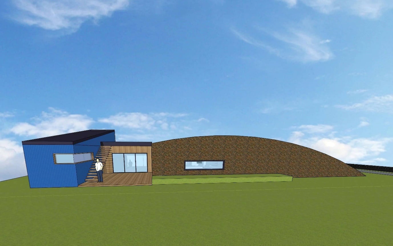 Shipping container on the left, green roof in the middle and an earth berm on the right.