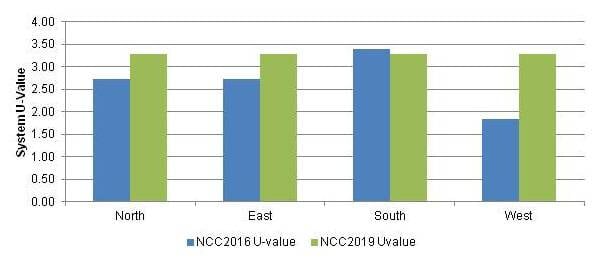 In this instance we can see that while the NCC2016 will still mandate fairly low and arguably unrealistic U-Values, the NCC2019 approach by taking into account the increased performance of the walls will require a U-Value of 3.28. While this can still be considered as a relatively performing window system it could be achieved by a standard aluminium frame.