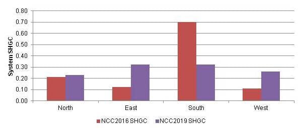In relation to the SHGC that would be required after the inclusion of external shading the performance remain relatively high regardless of the NCC version used. However, the NCC 2019 seems to provide a more streamlined solution across facades.